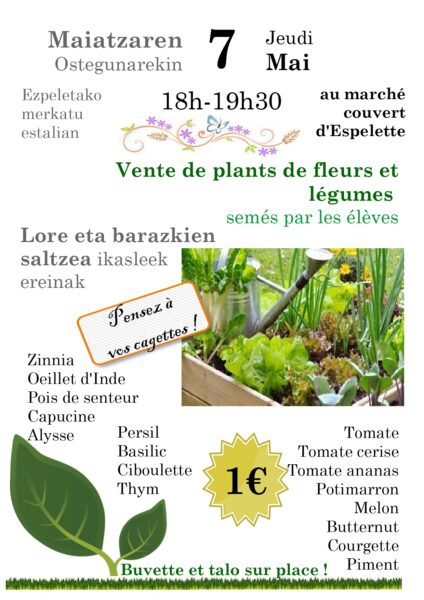 Vente de plants de fleurs et légumes Vente de plants de fleurs et légumes semés par les élèves de l’ Ecole publique d’ Espelette. Le jeudi 7 mai 2026 de 18h à 19h30 au marché couvert. PartagerFacebookTwitterImprimer