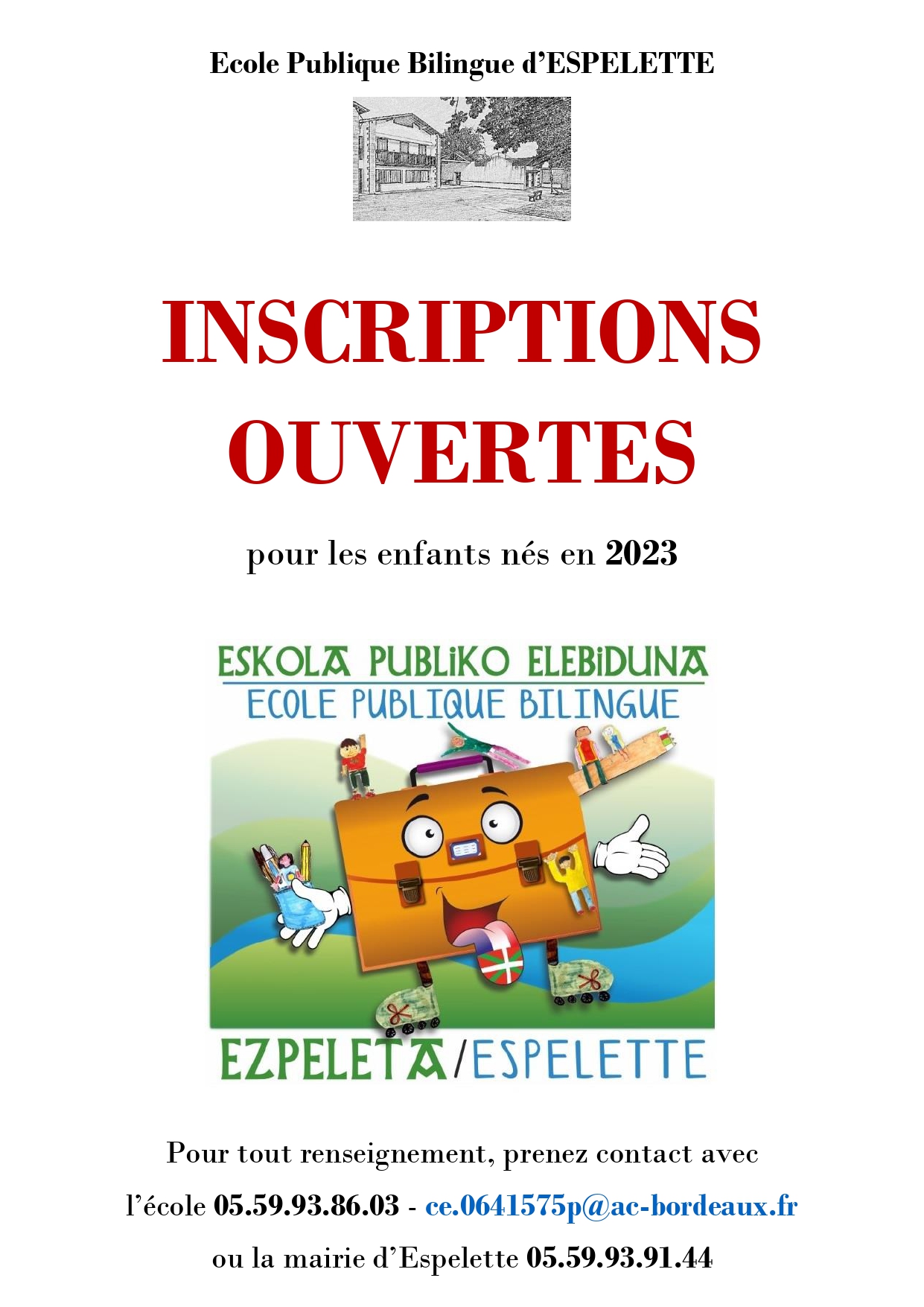 INSCRIPTIONS OUVERTES pour les enfants nés en 2023 Ecole Publique Bilingue d’ESPELETTE Inscriptions ouvertes pour les enfants nés en 2023. PartagerFacebookTwitterImprimer
